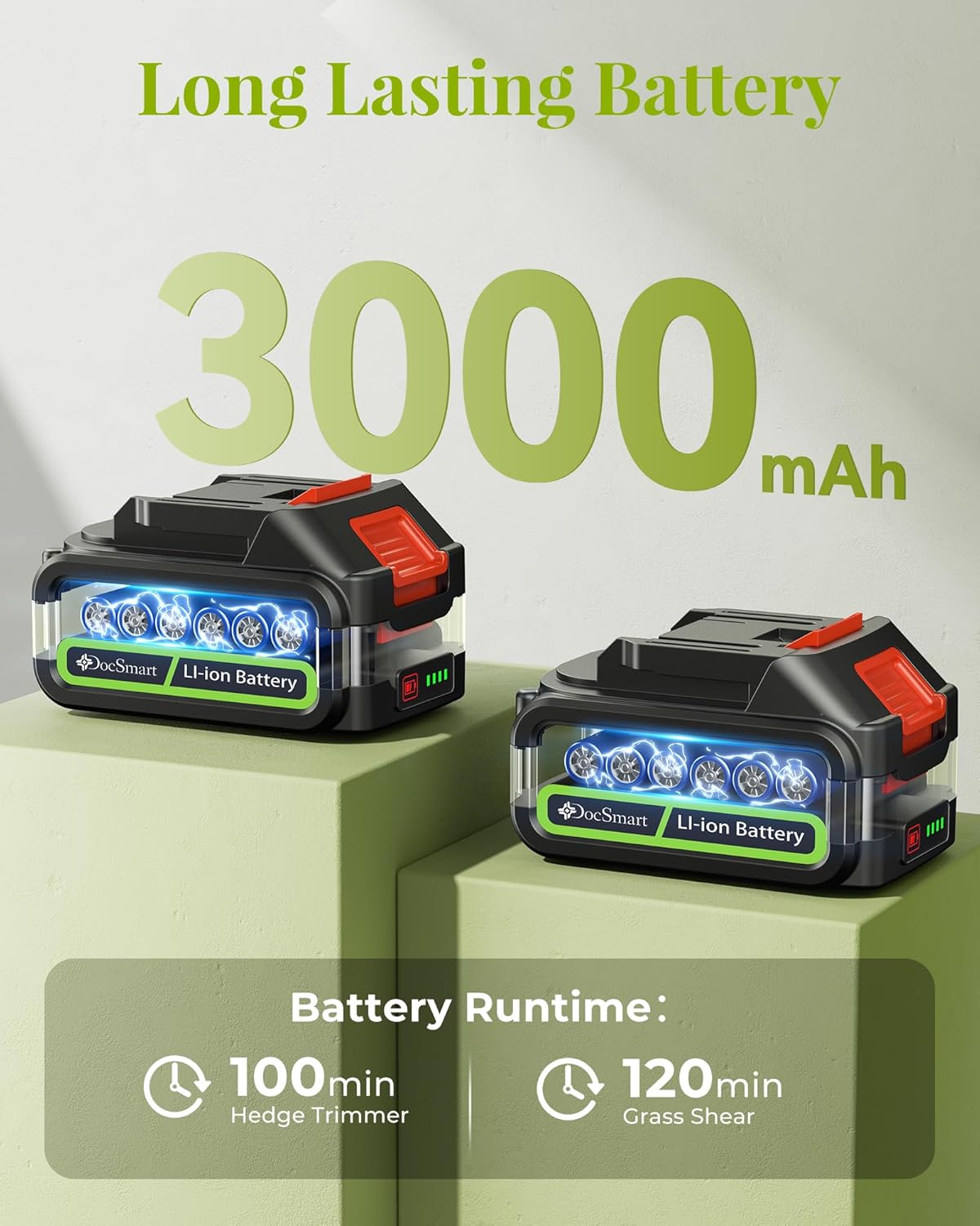 - Cordless & Portable: The small handheld hedge trimmer takes about 1.5 hours to charge and can work for 100-120 minutes. It comes with 2 pcs 1500mAh rechargeable batteries. 1 green light on the battery represents 25% power. Say goodbye to struggling with electrical cords and make your garden art easier