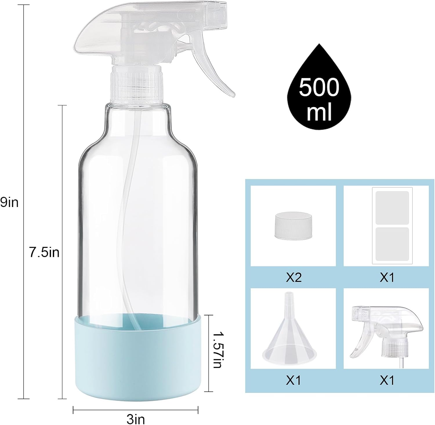 - Package includes: Made from recyclable glass, this spray bottle with sleeve set supports a sustainable lifestyle. Each package includes 2 16.9oz glass spray bottles, 2 silicone sleeves, 1 extra spray nozzle, 1 funnel, 1 label and 2 screw caps.